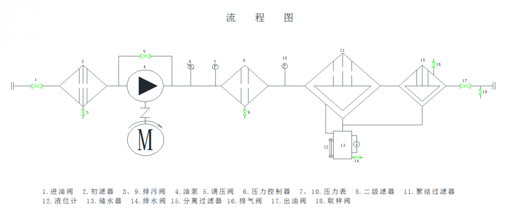 不合格的油液首先进入初级过滤,大颗粒杂质被截留,除去大颗粒杂质的油液再由油泵输送到精滤器,在精滤器中除去较小的杂质后,继续进入聚结分离器内,其内利用分子分离技术原理对油液进行变压解析、消除分子间结合力,使油液中溶解水、游离水、快速溃破油膜脱离油分子而析出;至此完成脱水除杂质,从而达到所需水分和清洁度的要求。